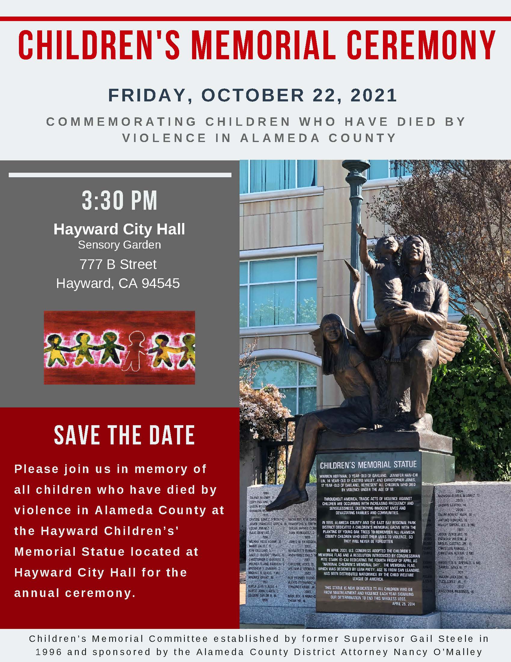 The 2021 Children’s Memorial Ceremony is scheduled on Friday, 10/22/2021, 3:30 PM, on the Hayward City Hall Plaza. This event is being sponsored by the Alameda County District Attorney’s Office, and is planned and organized by the Children’s Memorial Project Committee, which the Jenny Lin Foundation is a member of. Public is welcome to come and observe the ceremony. Click the image below to see details of the event: