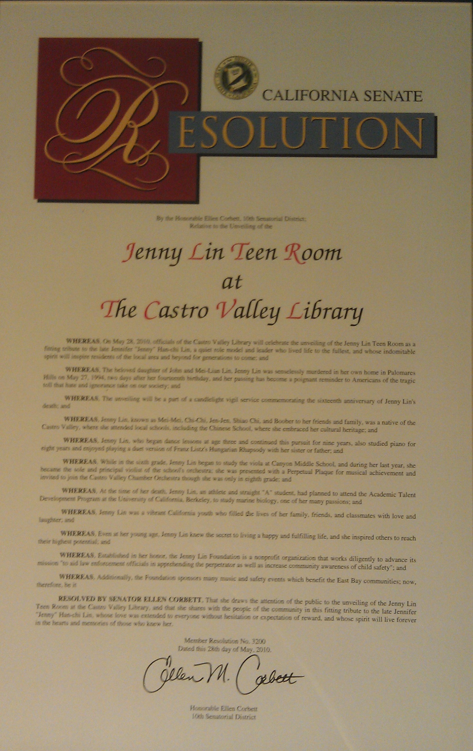 - California Senate Resolution of the Jenny Lin Teen Room, by Sen. Ellen Corbett, May 28, 2010
