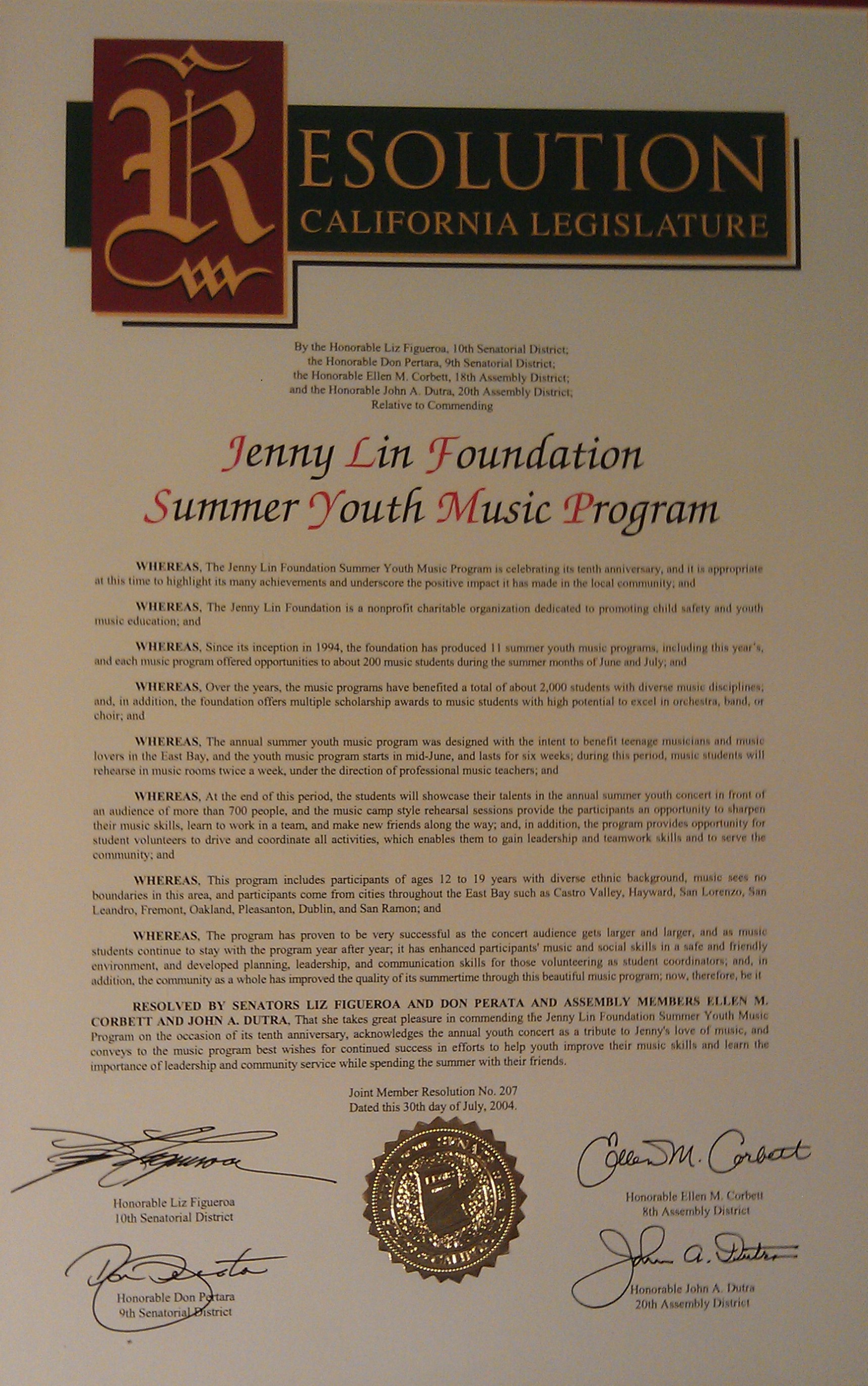 - California Legislature Resolution of the Jenny Lin Youth Music Program, July 30, 2004